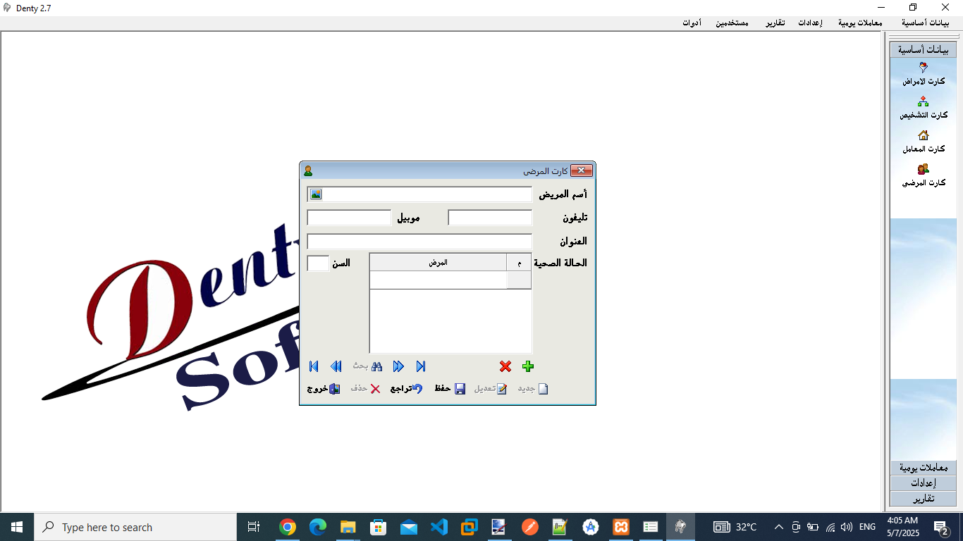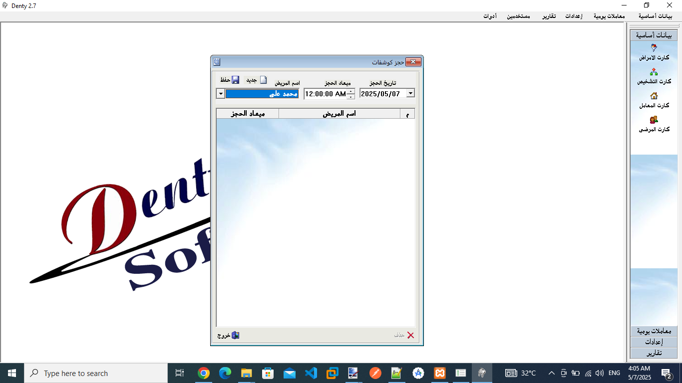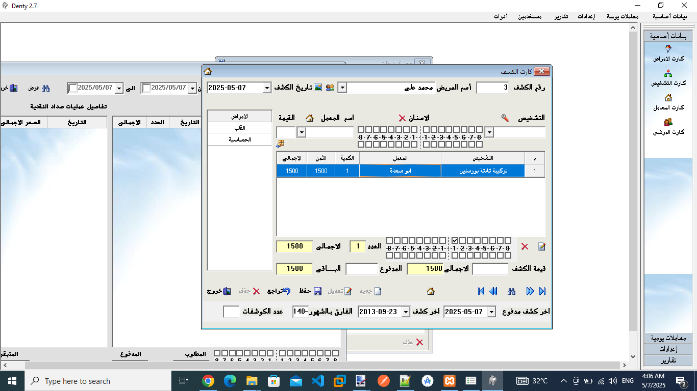 برنامج لادارة عيادات الاسنان من تسجيل بيانات المرضي وحالاتهم الصحية ومتابعة حساب المرضى وحساب المعامل مع مجموعة من التقارير القيمة